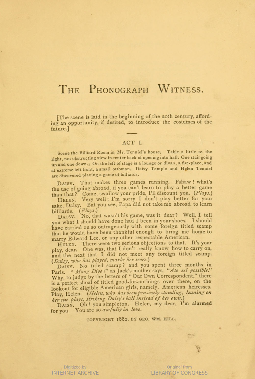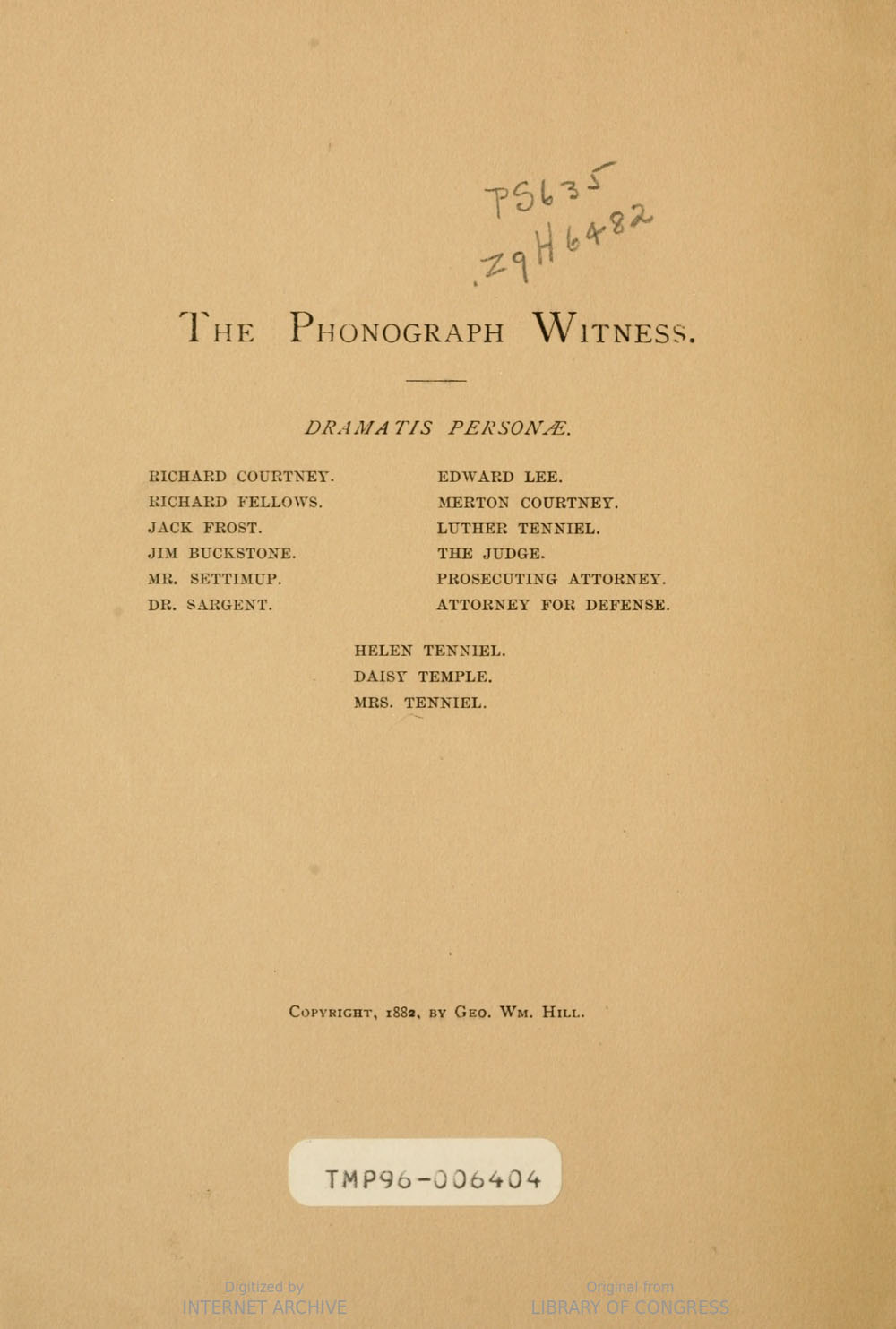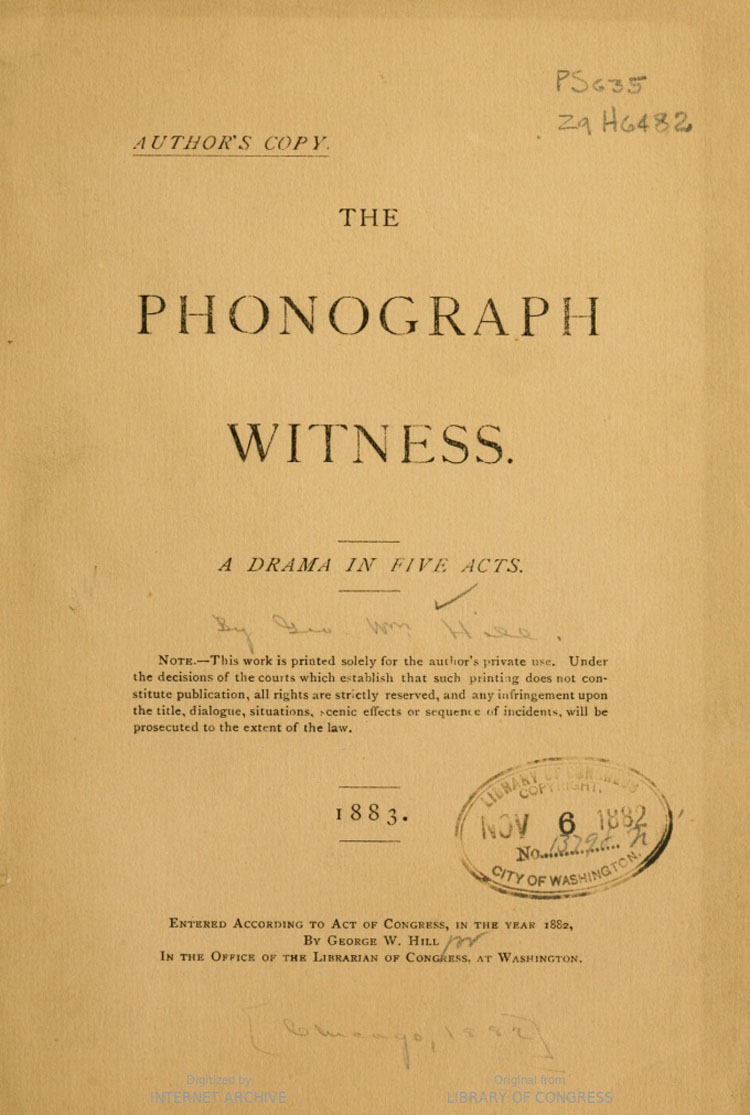 This five act drama was written by George W. Hill and deposited in the Library of Congress on November 6, 1882. It's a love story with the phonograph (only invented five years earlier and in reality still just a novelty) playing a role of "essential witness" in a murder trial.