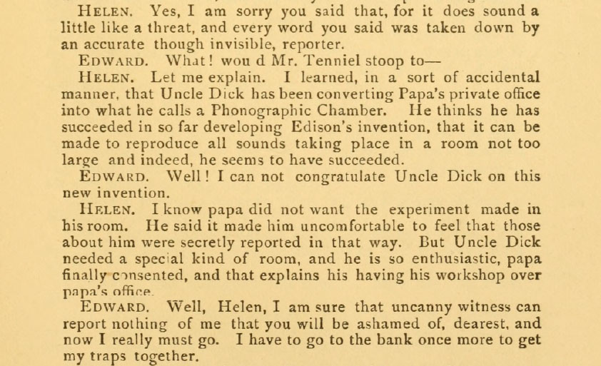 It's revealed in Act 1 that Helen's Uncle Dick has made her father's office a "Phonographic Chamber" where all sounds heard in that room are recorded by Uncle Dick's improved phonograph which is "an accurate though invisible, reporter" capable of being a "canny witness."