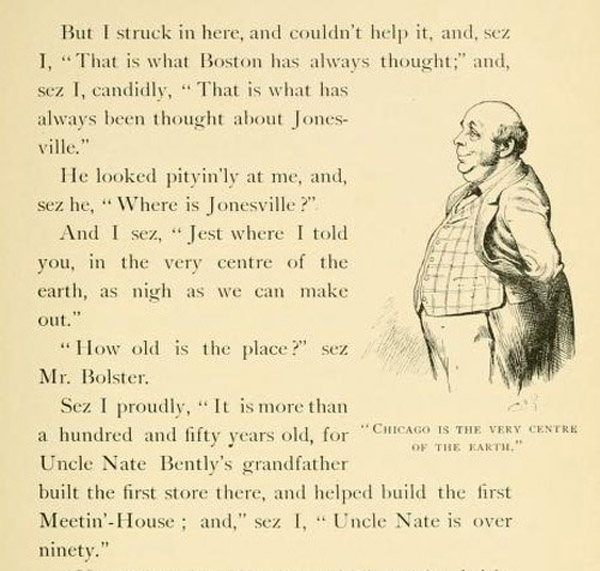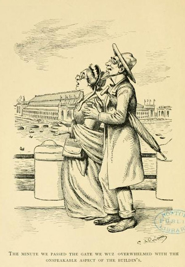 Samantha and Josiah Allen are simple Jonesvillians traveling to the big city of Chicago and their rural dialect and comments remind me of the early recording artist Cal Stewart and his Uncle Josh Weathersby character and Punkin' Centre stories which included visits to New York City, Coney Island and Boston. Uncle Josh had his Deacon Witherspoon; Josiah and Samantha had their Deacon Henzy; Uncle Josh had Punkin' Centre; Joshiah and Samantha had Jonesville. Samantha and Josiah's visit to Chicago and its World's Fair is secondary to Samantha's contemporary focus and comments on politics, religion, prohibition, woman's rights, and a preference for just being at home. Likewise, Cal Stewart said all he ever wanted to do with his stories was make people laugh.