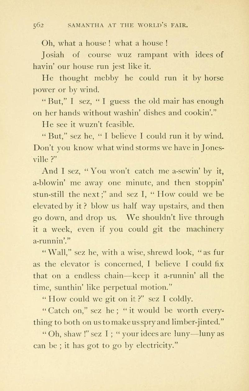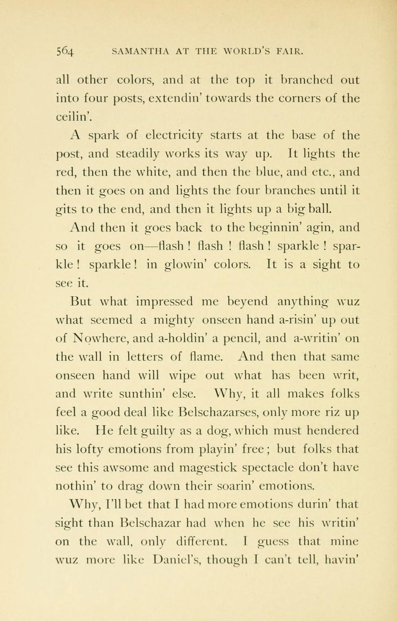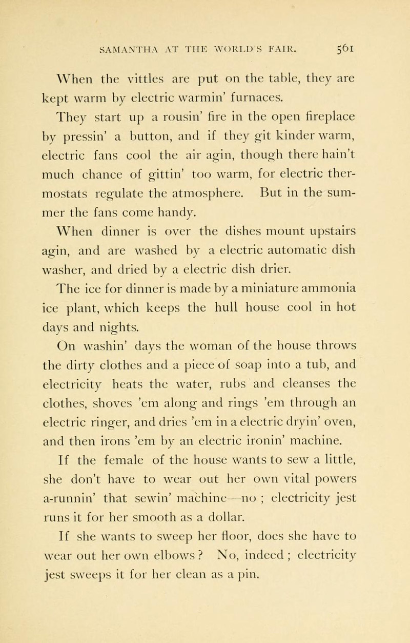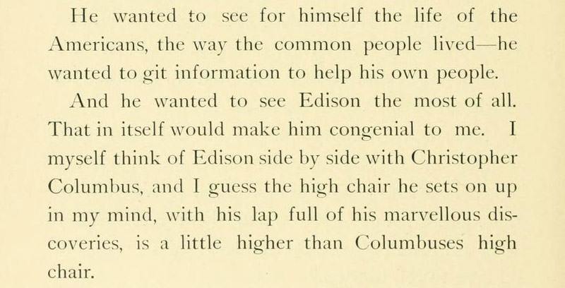 Chapter XVIII's "The Electricity Building" describes the wonders of electricity in 1893 featuring the Electric House "all fitted up from basement to attic with electricity." A phonograph in its parlor offers selections from "operatic or sacred music or comic songs....Or if they want to hear Gladstone debate, or Chauncey Depew joke, or Ingersoll lecture, or no matter what their tastes are, they can be gratified. The phonograph don't care; it will bring to 'em anything they call for."