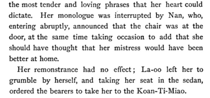 In the end the affection of La-oo and Kin-Fo was unalterable; "prosperity awaited them throughout their future life; and only by a visit to the yamen in Shang-Hai could the measure of their mutual happiness be realized." (p. 262)