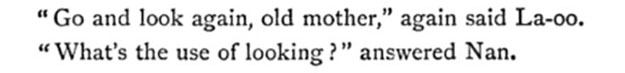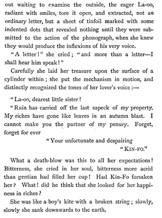 That letter would later be heard by Kim-Fo who had returned to La-oo in Peking. Nan's words would also be heard as Nan hadn't realized that the phonograph was still recording when she had abruptly interrupted La-oo's monologue, much to her regret. (pp. 159-160) - "Man-servants and Maid-servants, beware of Phonographs!"