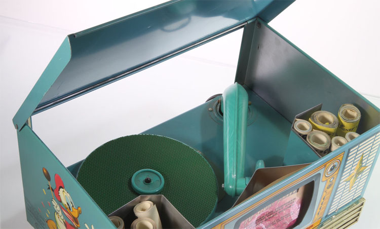 The 1935 Mickey Mouse "Talkie-Jecktor" was an updated version of the Movie Jecktor Company's "Movie-Jecktor." By adding a phonograph turntable, stylus and horn the projected paper film strips could be accompanied by recorded sound.