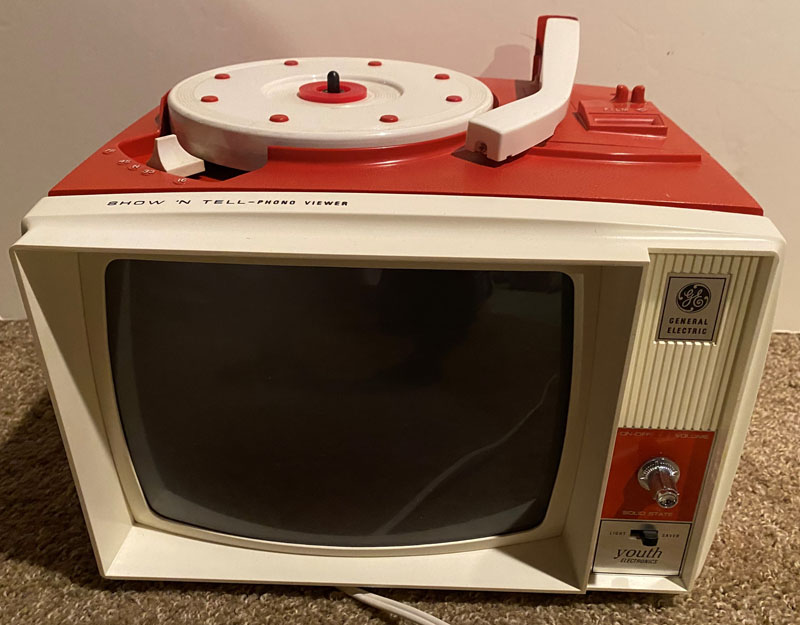"The Show 'N Tell is a toy combination record player and filmstrip viewer manufactured by General Electric from October 1964 to the 1970s at GE's Utica, NY facility." (Wikipedia). Other companies like Child Guidance made phono-viewers and picturesound programs into the 1980's.