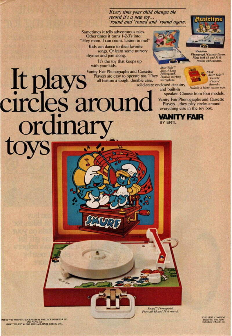 The colony of Smurfs loved to have fun and Vanity's Fair's 1983 phonograph with two Smurfs dancing on a record playing on a gramophone is one of the best examples of fictional popular culture characters graphically connected with a phonograph. As advertised, "it plays circles around ordinary toys."
