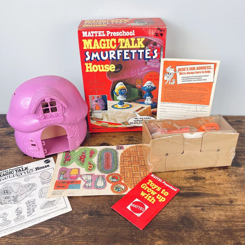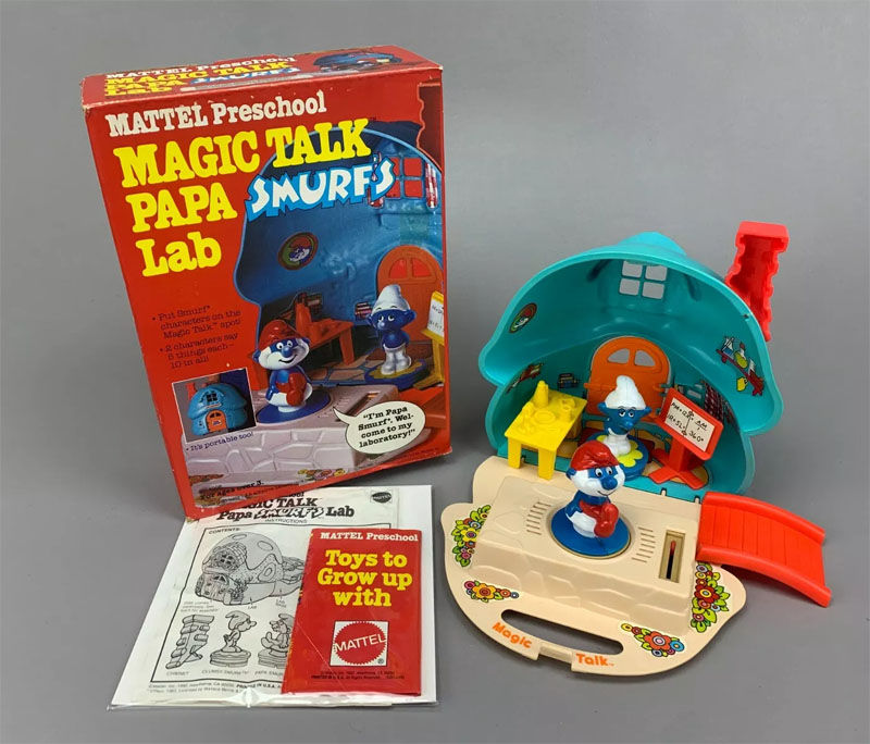 Mattel Preschool Magic Talk Smurf Village, 1982. Put the figures "on the Magic Talk™ spot and they talk" (using a small disc that plays on a miniature record player.)
