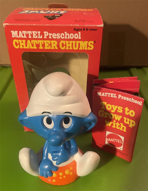Note: Mattel's Chatter-Chum pull-string toys used a miniature record and playing mechanism inside its figures and included Smurf and Smurfette in their series of talking characters. c. 1982 (Smurf, FP0143)