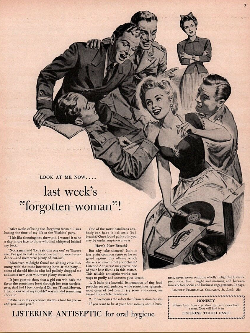 "I danced every day -- and there were plenty of 'cut-ins'. Listerine magazine ad, 1942