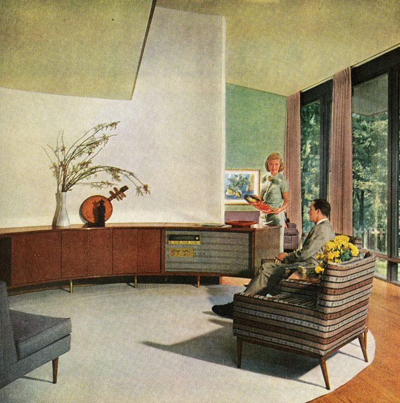 Ozite Carpet Tiles in Rec Room with Retro open horn LP Phonograph, 1968 (PM-2043)