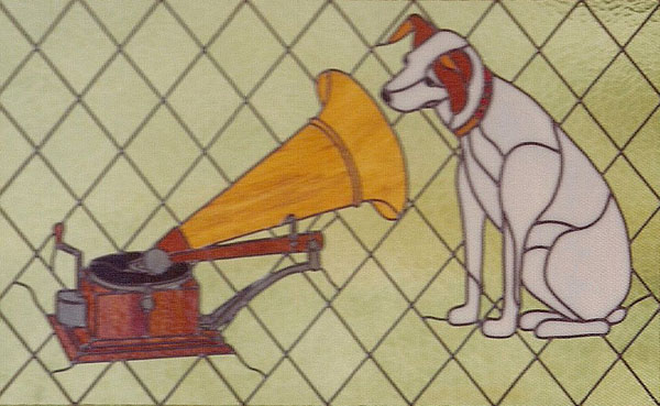 Description: This window features Nipper, one of the most famous advertising images of all time, listening to the Berliner Gramophone.
