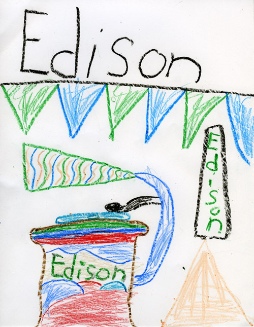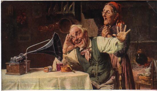 Description: This photograph (top) is a re-creation of the famous oil painting (below) by Massani in 1905. Edison used this piece (in this case as an advertising postcard) in literally hundreds of thousands of Edison Phonograph advertisements.