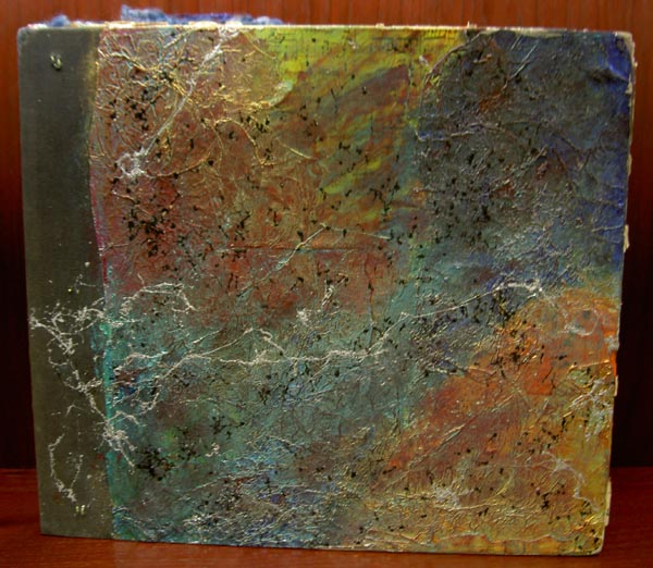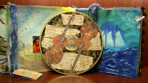 The following phonograph albums altered as mixed media pieces using a process called an Altered Book Round Robin. The project started with an old phonograph album and was sent to each participant to "create" their own page. Altered Books are a popular way to creatively share words and images and artistic expressions and this one, because of the phonographia element, found its way to this gallery. Mixed Media and Phonographia, 12" x 14" in private collections.