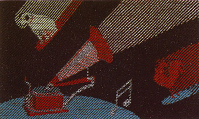Although the piece was commissioned to celebrate Edison's cylinder playing tin-foil phonograph "finished" on December 6, 1877, no Edison phonographs or logos are included in this artwork. Instead, other phonograph industry trademarks and symbols are displayed featuring the disc record technology. The talking machine is Berliner's Gramophone performing the dual role of a searchlight and record player. The Victor dog "Nipper" speeds through the sky standing on a disc record. The rival Pathe Rooster flies by on another record.The Columbia Graphophone Company's logo "Note the Notes" is the other piece of phonographia floating in the cosmos.