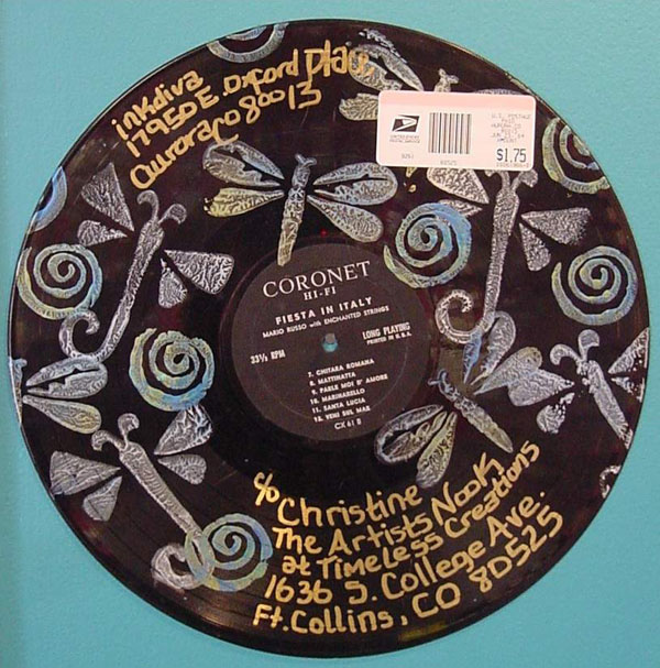 Description: This phonograph record was mailed from one artist to another with a note written on the reverse side. This is of a genre called 'Mail Art' where different objects are artistically altered and then sent through the mail, possibly back and forth, from one artist to another. As you can see from the post this record was mailed as you see it here. This phono mail was created by Susan Wacob and is owned by Christine Webb owner of The Artists' Nook in Fort Collins, Colorado.