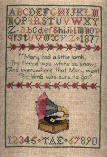 Description: This sampler was a 1981 artistic entry for the Friends of the Phonograph's annual birthday party. Besides the traditional alphabet, Kathy Aiken's sampler features the first four lines of the nursery rhymn "Mary Had a Little Lamb" which were the first words spoken by Edison's tin-foil Phonograph in December 1877. The bottom row of numbers has Thomas Alva Edison's initials TAE inserted between the 6 and 7.