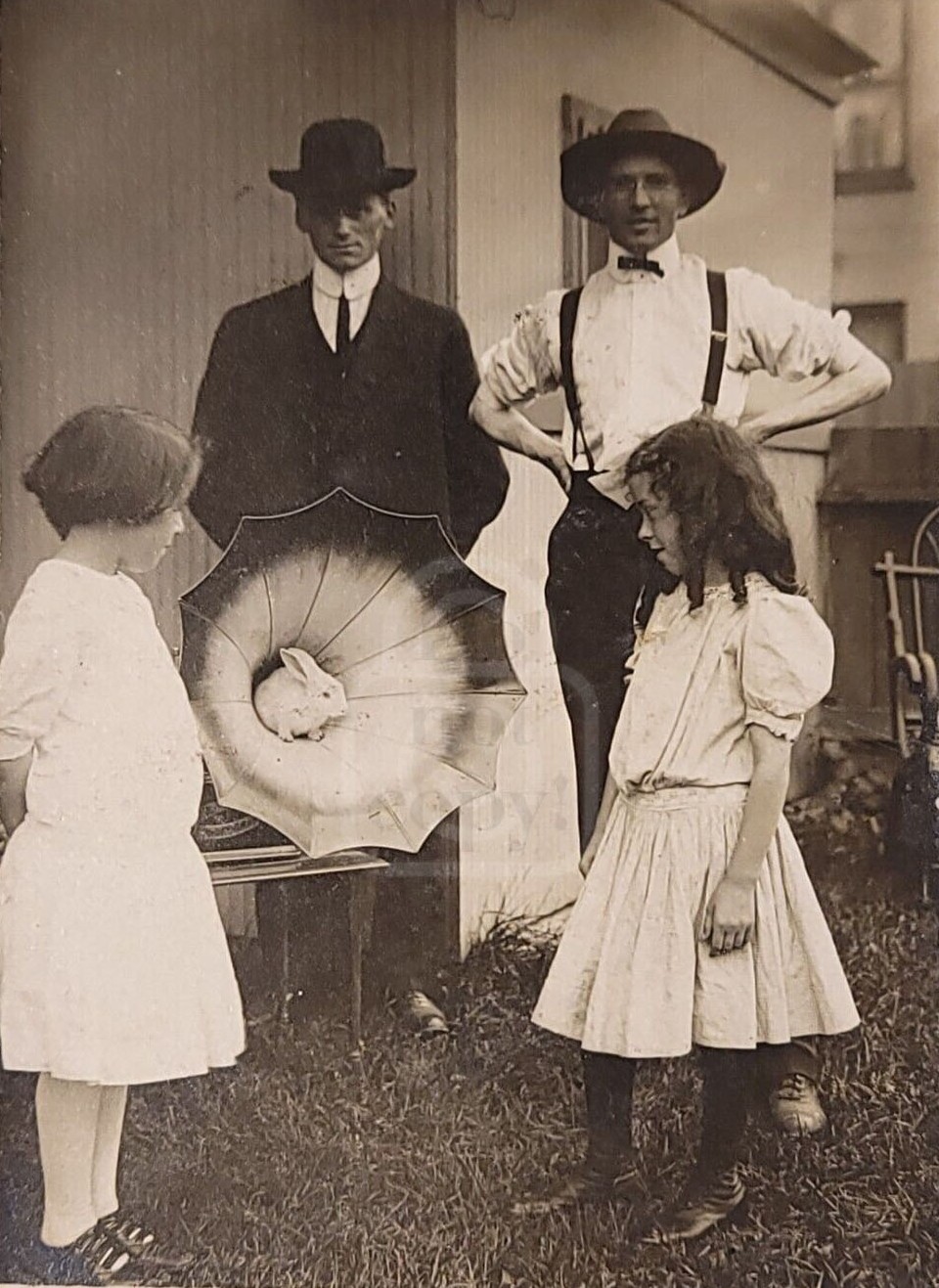 Billings Family portrait with Phonograph. Allen Billings family photographed outside their house with doll and Phonograph on chair - morninglory horn with flowers, ca. 1910. (PM-0025) |