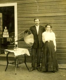 Tom and Mary Combs with Edison Standard 1909 (PM-0671). A sewing machine can be seen inside the doorway with Edison cylinder record boxes stacked on. | ||||