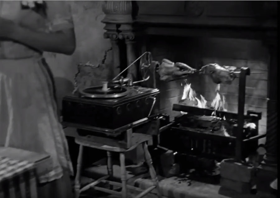 And who could forget the honeymoon night dinner preparation scene where Donna Reed is roasting chicken on a spit in the fireplace with a spring-wound phonograph supplying the music and the power for turning the spit?